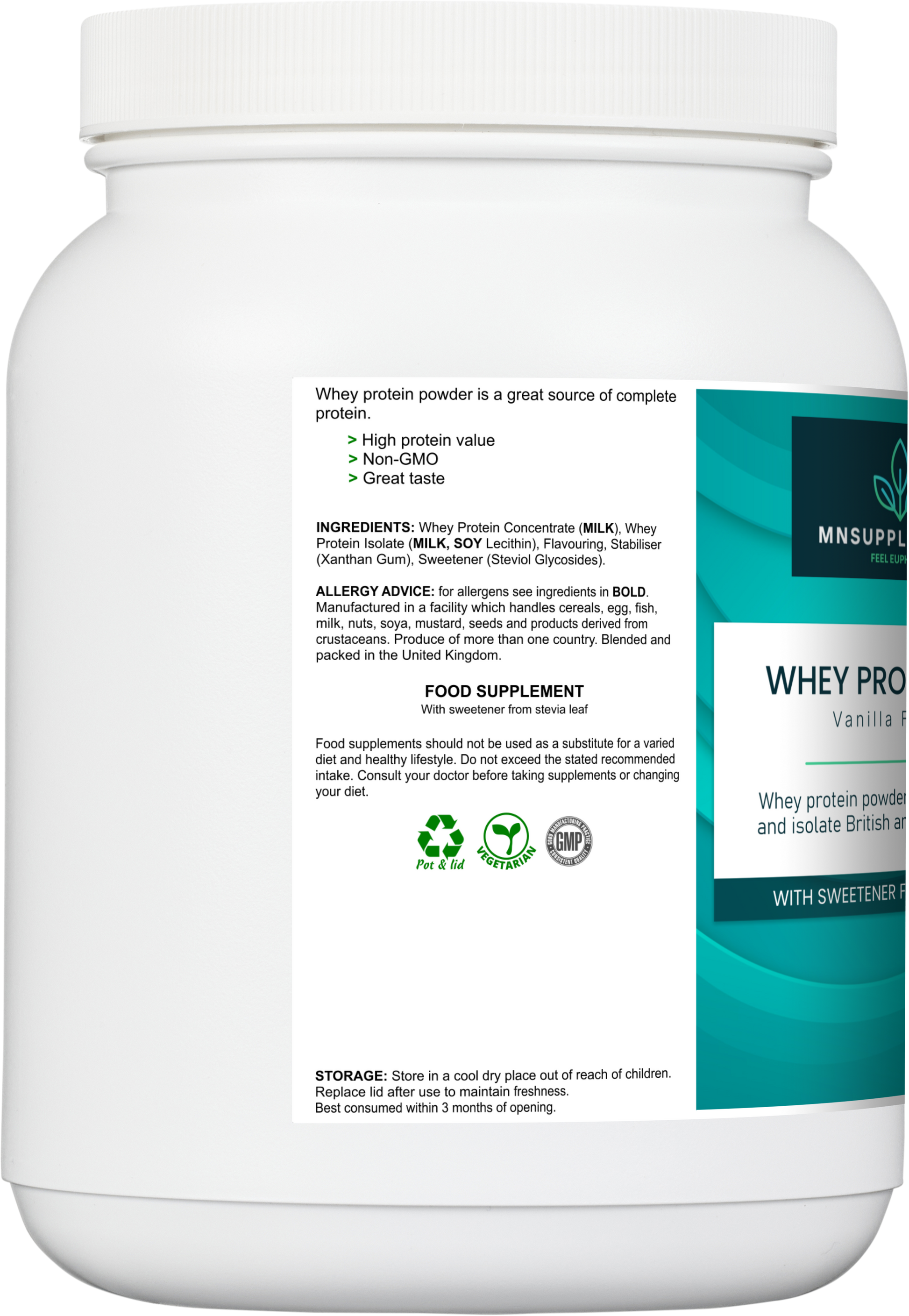 A delicious vanilla flavoured whey protein powder shake, derived from a blend of high quality whey protein concentrate and whey protein isolate.